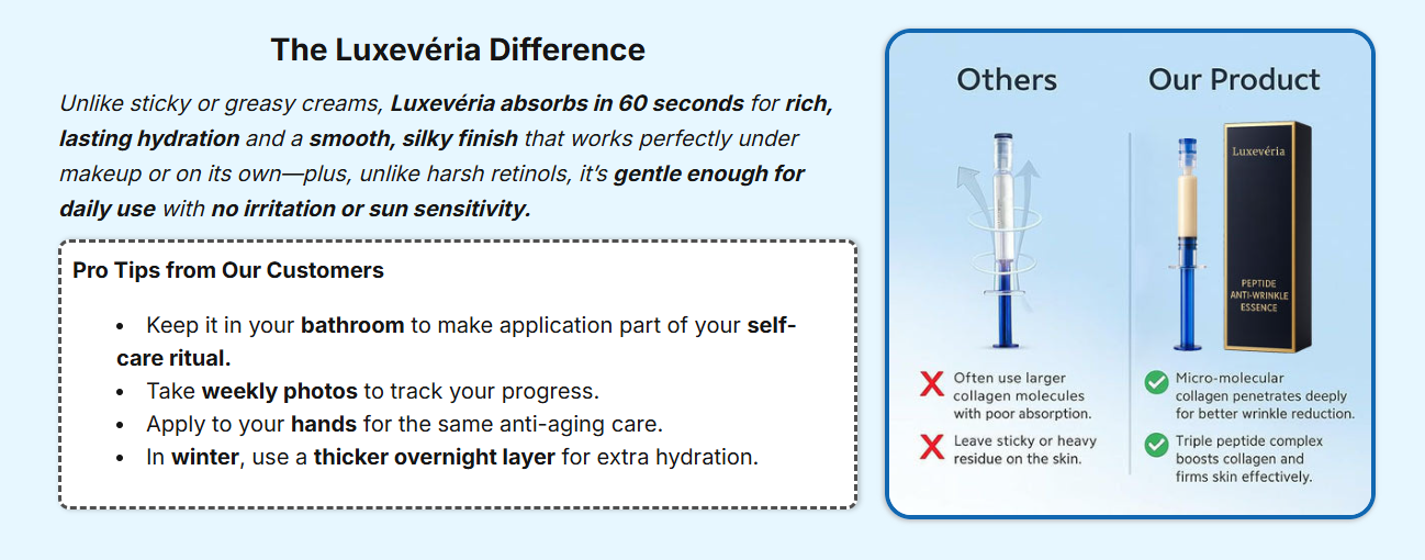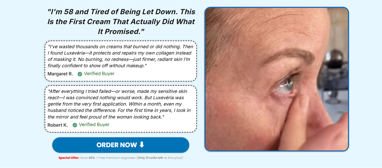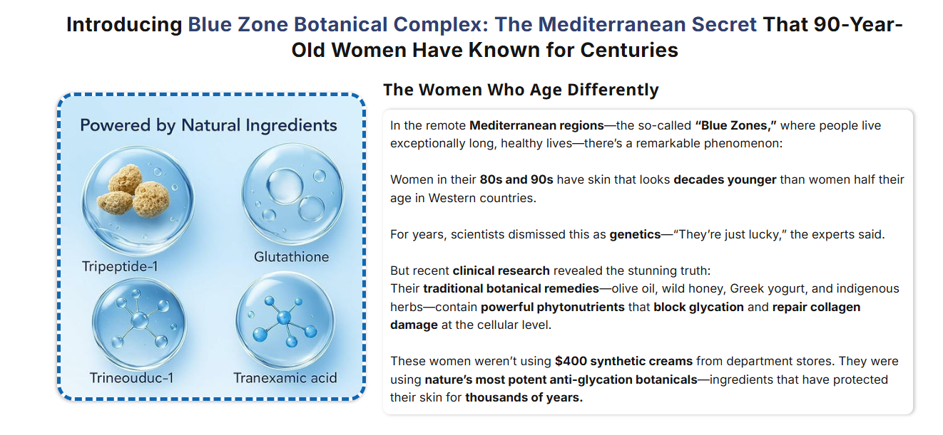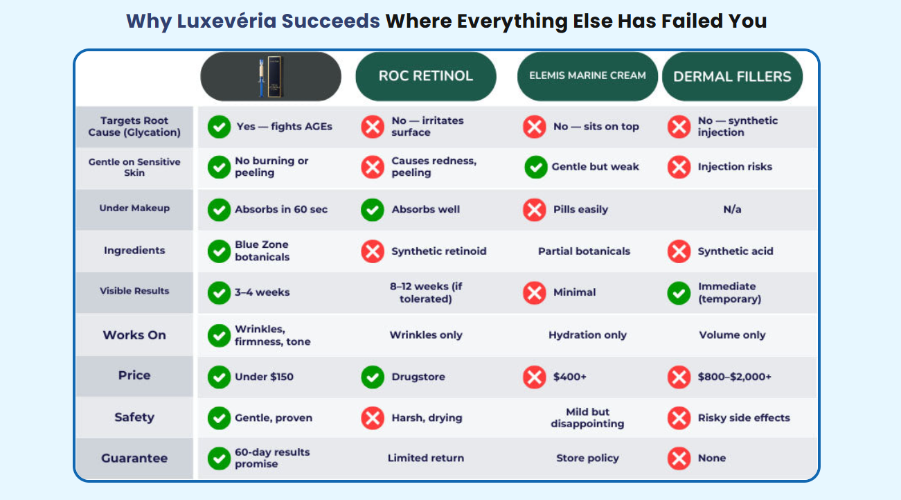 Luxevéria is the first cream to harness these Blue Zone botanicals in concentrated clinical formulationsspecifically designed to fight the collagen-destroying process that's been aging you.